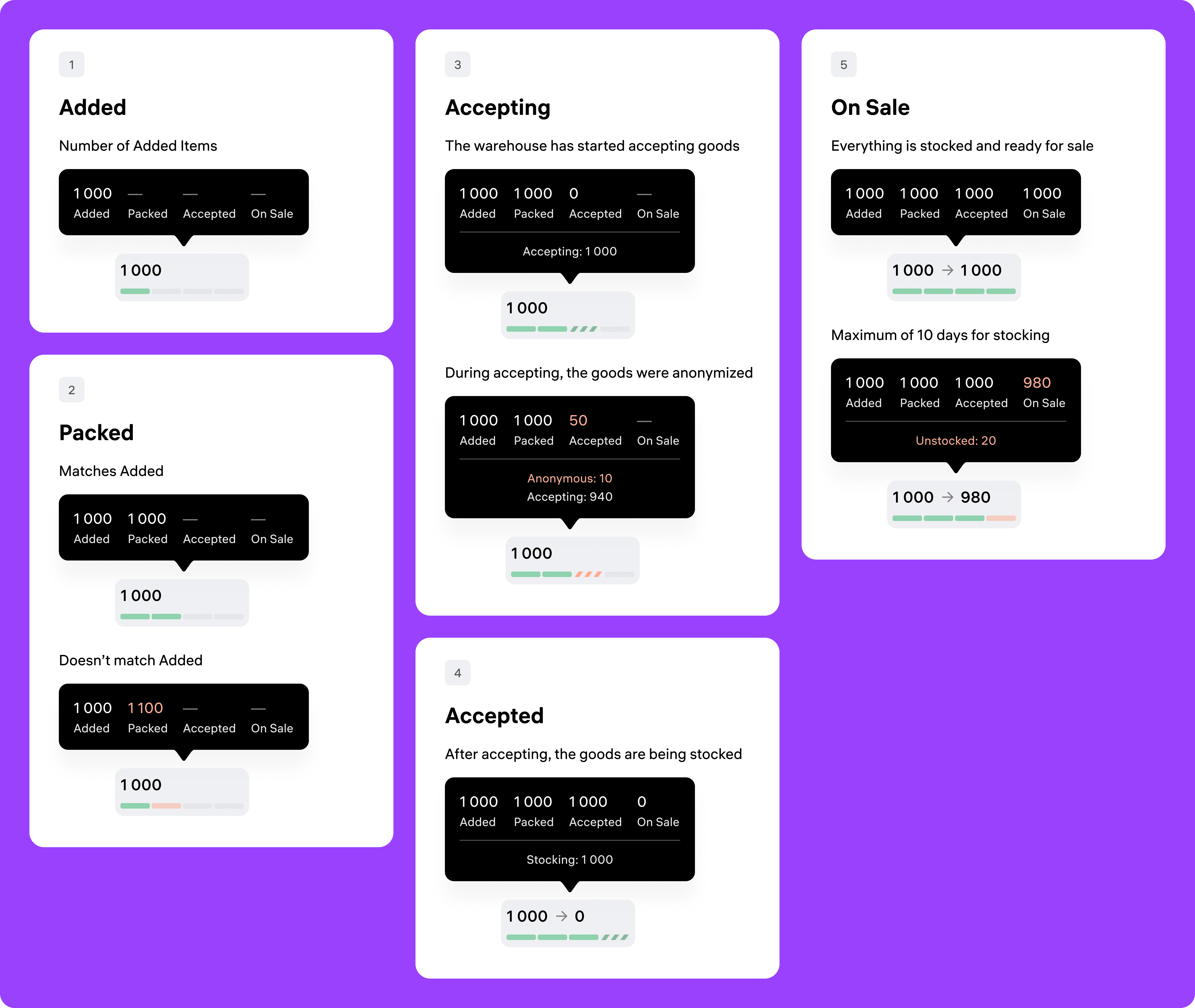 In the redesigned table, I added a «Goods Flow» cell, which clearly shows the status of items in the shipment. This gives sellers a quick overview of what’s happening with their products — without needing to click through